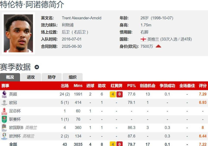 阿诺德是利物浦青训的杰出代表,自2016-17赛季升入一线队以来,迅速成长为球队主力右后卫,并被誉为英超第一进攻型右后卫。他凭借精准的长传和出色的进攻能力,成为球队的重要进攻发起点。本赛季,阿诺德为利物浦各项赛事出场35次,其中31次首发,贡献3球7助。